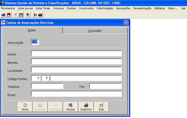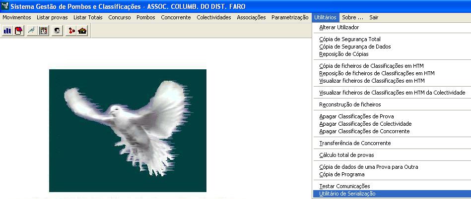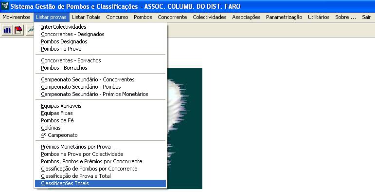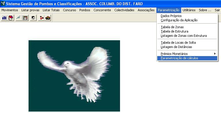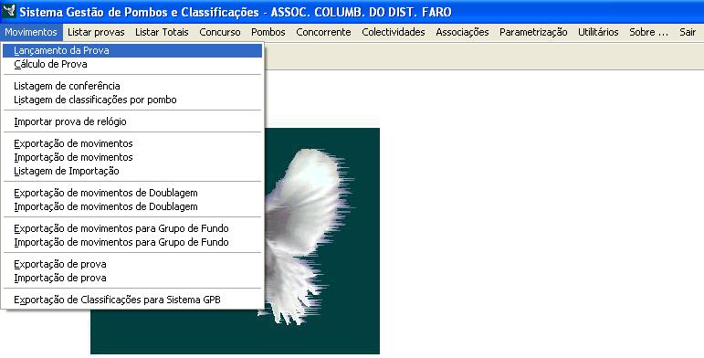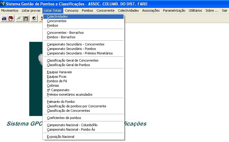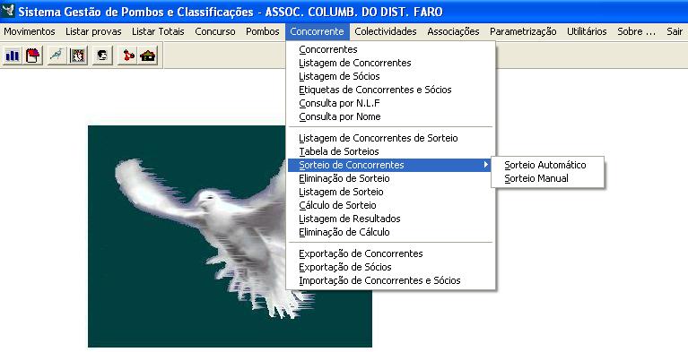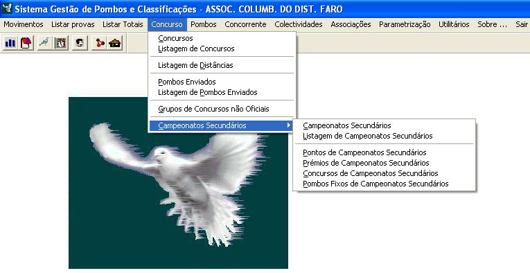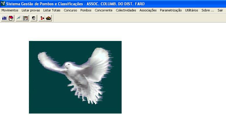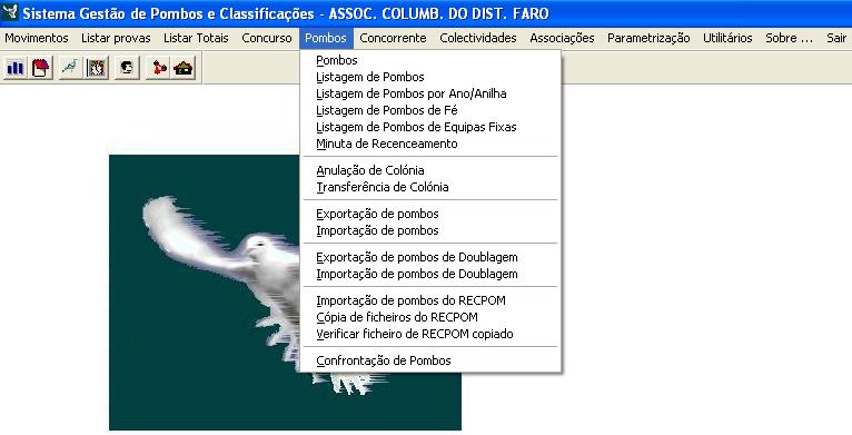 Este é o menu principal do Sistema. É aqui que se navega para os vários sub-sistemas existentes – Pombos, Concursos, Classificações, Colectividades, Associados e Utilitários.